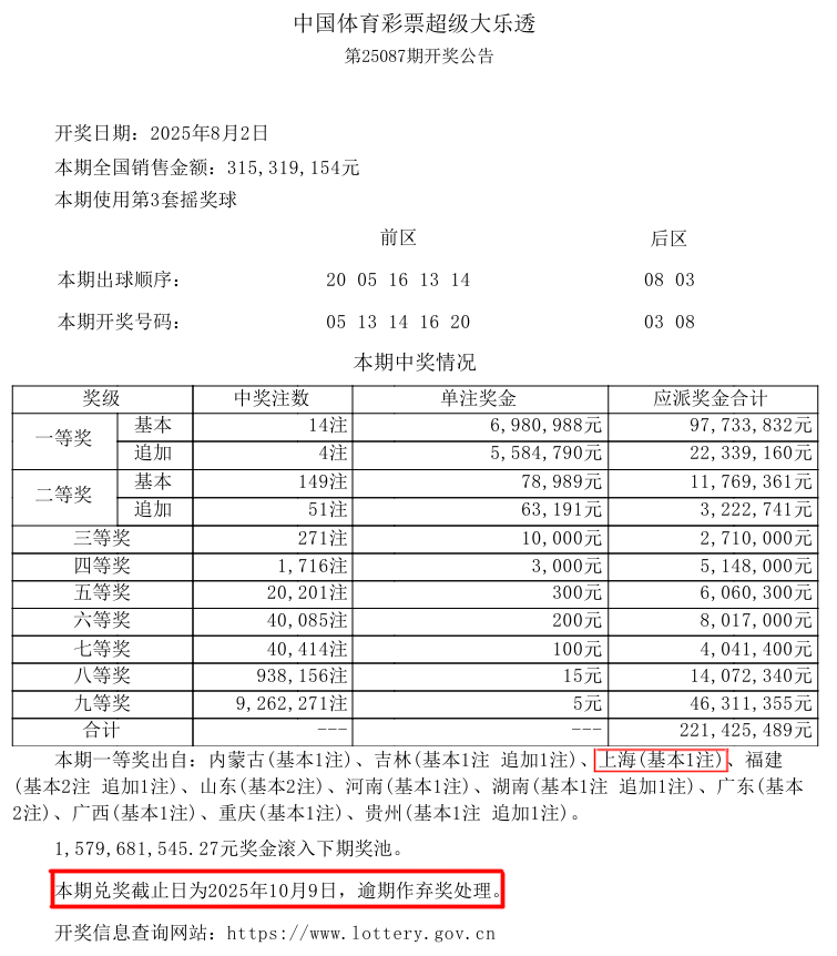 8月2日,超级大乐透第25087期开奖。前区开出号码05、13、14、16、20;后区开出号码03、08。当期上海开出1注基础一等奖,中奖彩票为一张金额42元的“7+2”复式票,单票奖金701万余元。该张大乐透一等奖彩票出自位于奉贤区航南公路5639-5699号3F(宝龙广场)的市属51907网点。该期大乐透兑奖截止时间为2025年10月9日。